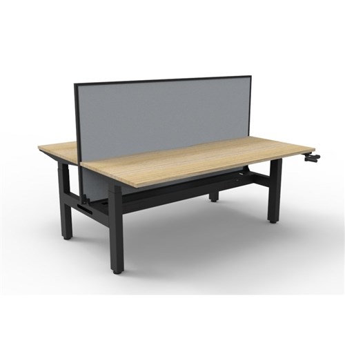 • Rapidline Boost back to back 2 person manual crank height adjustable workstation with cable tray and screen. Oak top with black frame.