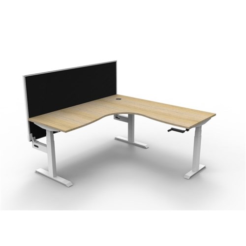 • Rapidline Boost manual crank height adjustable corner workstation with screen. Natural oak top with white frame.