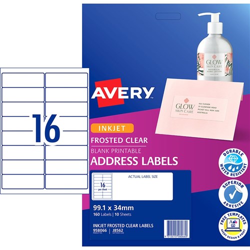 Avery Frosted Clear Inkjet Address Labels J8562 99.1x34mm 16UP 160 Labels 10 Sheets