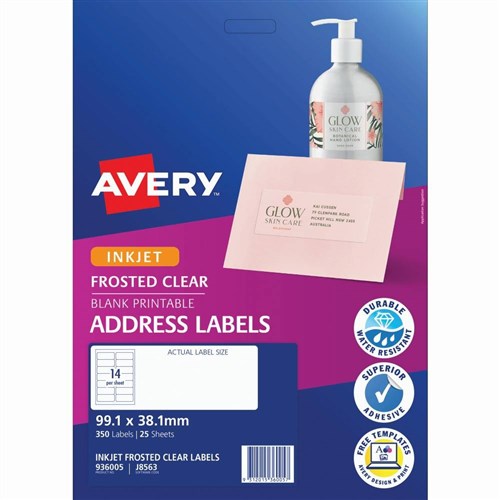 Avery Frosted Clear Inkjet Address Labels J8563 99.1x38.1mm 14UP 350 Labels