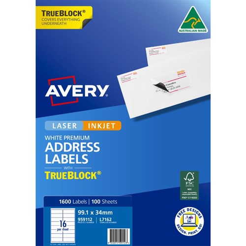 Avery Trueblock Address Labels Laser L7162 99.1 x 34mm 16UP 1600 Labels