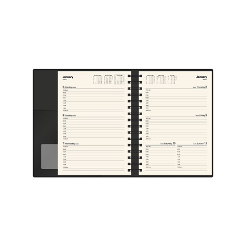 • Pen loop, lay flat opening, ribbon marker and week to view layout.