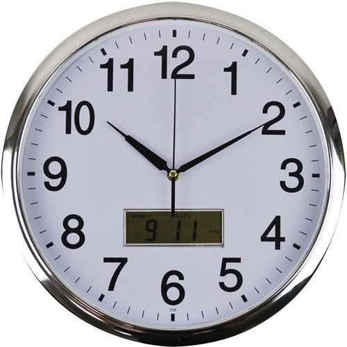 Italplast Wall Clock Inset LCD Date Month 36cm Round Chrome Frame White Face