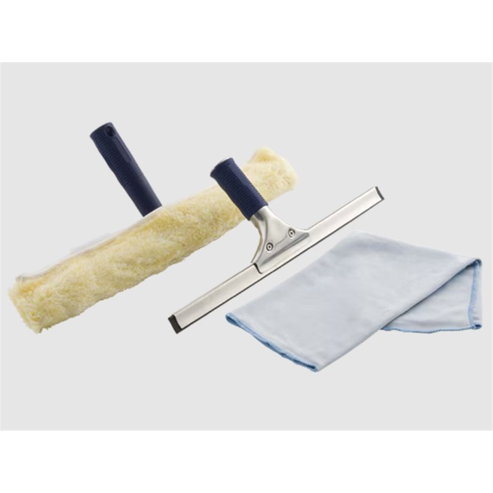 • Make the task of cleaning your windows easy with this 3 piece window cleaning kit that contains 35cm squeegee , 35cm T bar with cover and a microfibre glass cloth to help get windows sparkling clean again