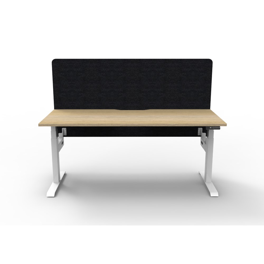 • Natural Oak top with rigid edging and 50mm deep scallop cut out. White Satin powder coat frame. Eco screen.