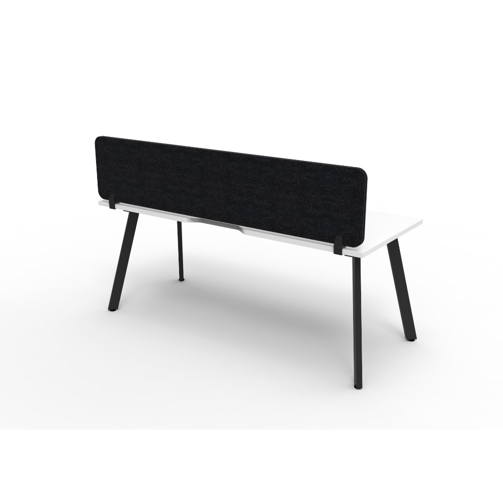 • Natural White worksurface with rigid edging and 410mmW x 50mmD scallop cable access. Black Satin powder coat frame. Eco screen.