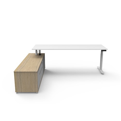 • Natural White top and White Satin frame. Height adjustable desk with left hand side cabinet.