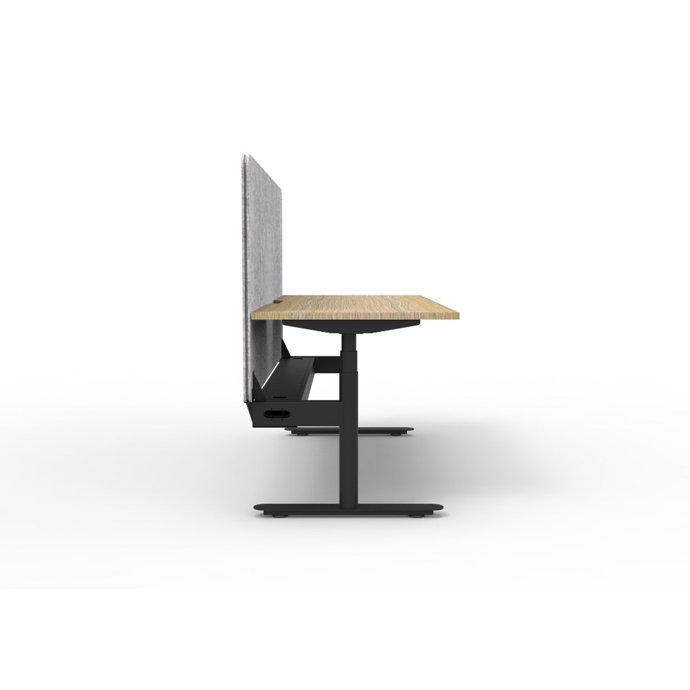 • Natural Oak worksurface with rigid edging and 50mm scallop cable cut out. E0 rated 25mm top. Black Satin powder coat round-leg frame. Eco screen and cable tray.
