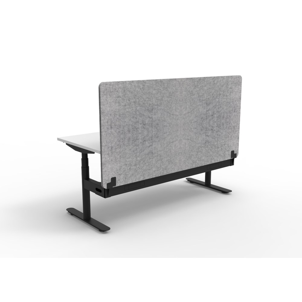 • Natural White worksurface with rigid edging and 50mm scallop cable cut out. E0 rated 25mm top. Black Satin powder coat round-leg frame. Eco screen and cable tray.